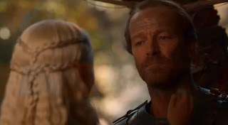 At 0:06 we see a close-up of Jorah kneeling to talk to Daenerys. He says "They are too weak to fight, you must be their strength." He is wearing his yellow shirt and they are on desert terrain. This shot crops up in the Daenerys character profile at 1:05. In that video we see an apparent response from Daenerys in the next cut at 1:07 where she turns to Jorah and nods. This is adapted straight from Dany's inner monologue in A Clash of Kings chapter 13 Daenerys I page 139 she thinks "They are not strong...so I must be their strength." To be told this rather than realising it on her own weakens her character slightly but I would rather keep good lines and give them to other characters than lose them to the adaptation process. The framing here seems to fit with a sequence shown in the Daenerys character profile (from 0:00 to 0:10) where Jorah warns her that heading away from the Red Waste will expose her to those that would kill her and take her dragons. In the wider shots of that sequence they are kneeling next to the horse Drogo gave her as a wedding gift, apparently dead. I think he is probably convincing her to press onwards despite their losses in this sequence.